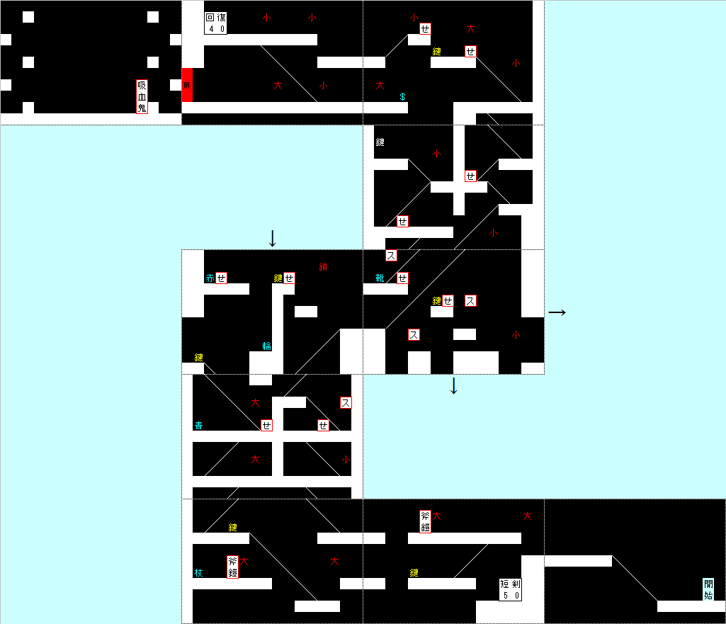 ホワイトキーをゲットしたら下に…この時にどーやってもせむし男からダメージ受けます。砂時計で時間を止めても階段を降りるときにせむし男に触れちゃいます。無理なもんは無理なんでここで受けるダメージは「ノーダメージクリア」の例外として。