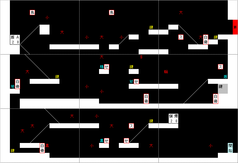 厄介な動きをする、せむし男とカラス、そしてデッドスケルトンが登場するステージ。 せむし男にさえ気をつければ特に問題となる点は無し。 中段真ん中エリアの盾Bは上段真ん中画面でカラスからダメージを受けて無敵状態のまま急いで落下。でないと取れません。落下地点にちょーど、せむし男がいるので。ただ、そこまでして取るような重要アイテムでないので無視してOK。 ロウソク(破壊可能ブロックを明示)は安価なのでシャレで買うもよし。ハート大がいっぱいあるステージなんで。