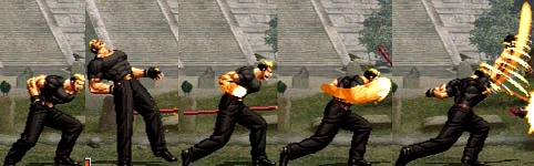 振り上げる腕に攻撃判定があって、超必以外では弱技からつながる唯一の技。威力無いし、ヒットしても大幅不利なんで、つないでもしょーがないけどな。